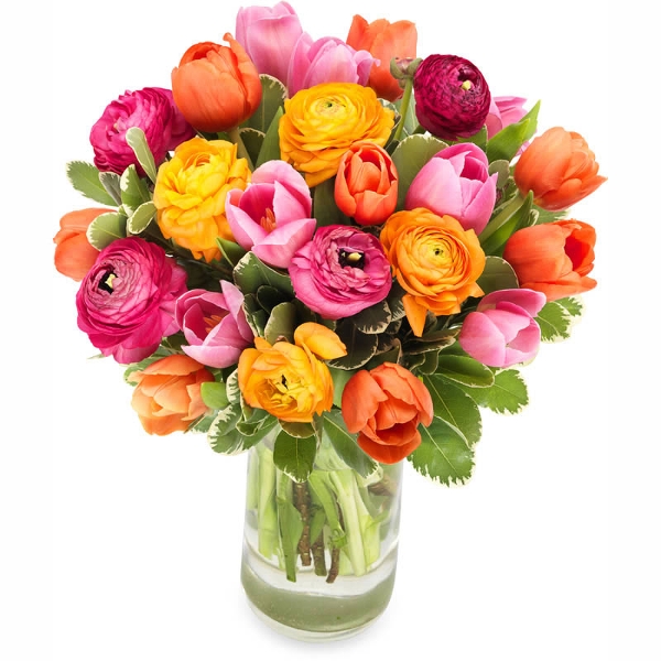 Dit boeket heeft iets bijzonders en brengt een vrolijke sfeer in huis. Door de mix van 2 grote seizoensfavorieten (tulpen en ranonkels) brengt dit boeket veel sfeer. (vaas niet inbegrepen)