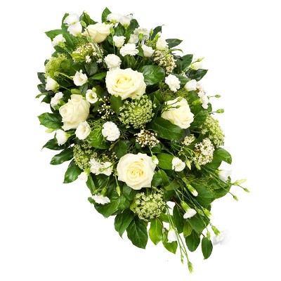Dit witte arrangement is een puur en respectvol afscheid van de overledene. Perfect als stijlvol, klassiek rouwstuk voor iemand die altijd in je gedachten zal zijn. Een mooi gebaar dat geen fortuin kost - met dit arrangement kun je je zorg en respect overbrengen zonder je budget te overschrijden.