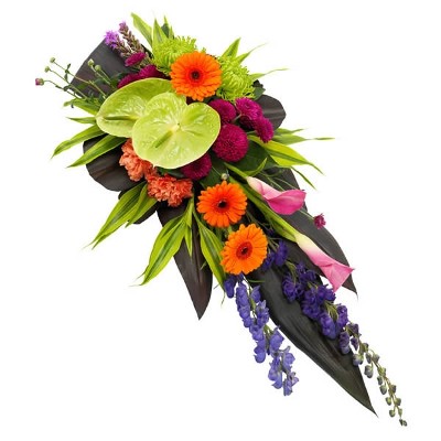 Vier het leven van een naaste met dit uitbundige stuk vol kleurige seizoensbloemen. Met bloemen zoals aronskelken, anthuriums, mini-gerbera's en chrysanten, als steun in de rug in een verdrietige tijd of als herinnering aan een kleurrijk persoon.