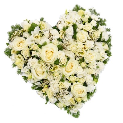 Deze hartvormige krans is een betekenisvolle herdenking van een naaste. De krans is opgemaakt met clusters van witte bloemen, waaronder rozen, anjers en lisianthus.